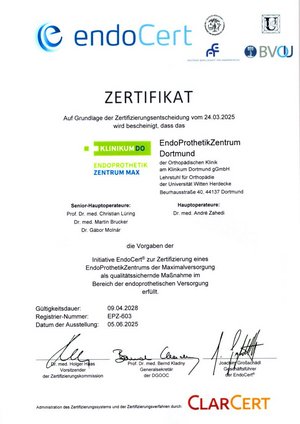 Am Klinikum Dortmund hat sich in der Orthopädischen Klinik um Prof. Dr. med. Christian Lüring ein Ärzteteam formiert, das sich speziell um den Bereich der Endoprothetik an Knie- und Hüftgelenk einschließlich der Wechseloperationen kümmert. Prof. Lüring verfügt über besondere Expertise im Bereich der Kniegelenksendoprothetik: er ist der einzige Operateur in Dortmund und Umgebung, der mit dem Focussiegel für Kniegelenksersatzoperation ausgezeichnet wurde. Im Mittelpunkt des Zentrums steht die spezialisierte orthopädische Behandlung. Darüber hinaus kann dem Patienten die oft notwendige umfassende Behandlung durch die anderen Spezialabteilungen des Klinikum Dortmund als Maximalversorger angeboten werden. Dieses ist insbesondere für die Patienten mit einer Arthrose des Knie- und Hüftgelenks von Bedeutung, die zusätzlich mehrere internistische Erkrankungen aufweisen. Speziell bei Wechseloperationen auf der Grundlage einer periprothetischen Infektion ist die enge Verzahnung und interdisziplinäre Zusammenarbeit mit dem Institut für Krankenhaushygiene maßgebliche Voraussetzung für den Erfolg der Operation und die Behandlungsqualität.