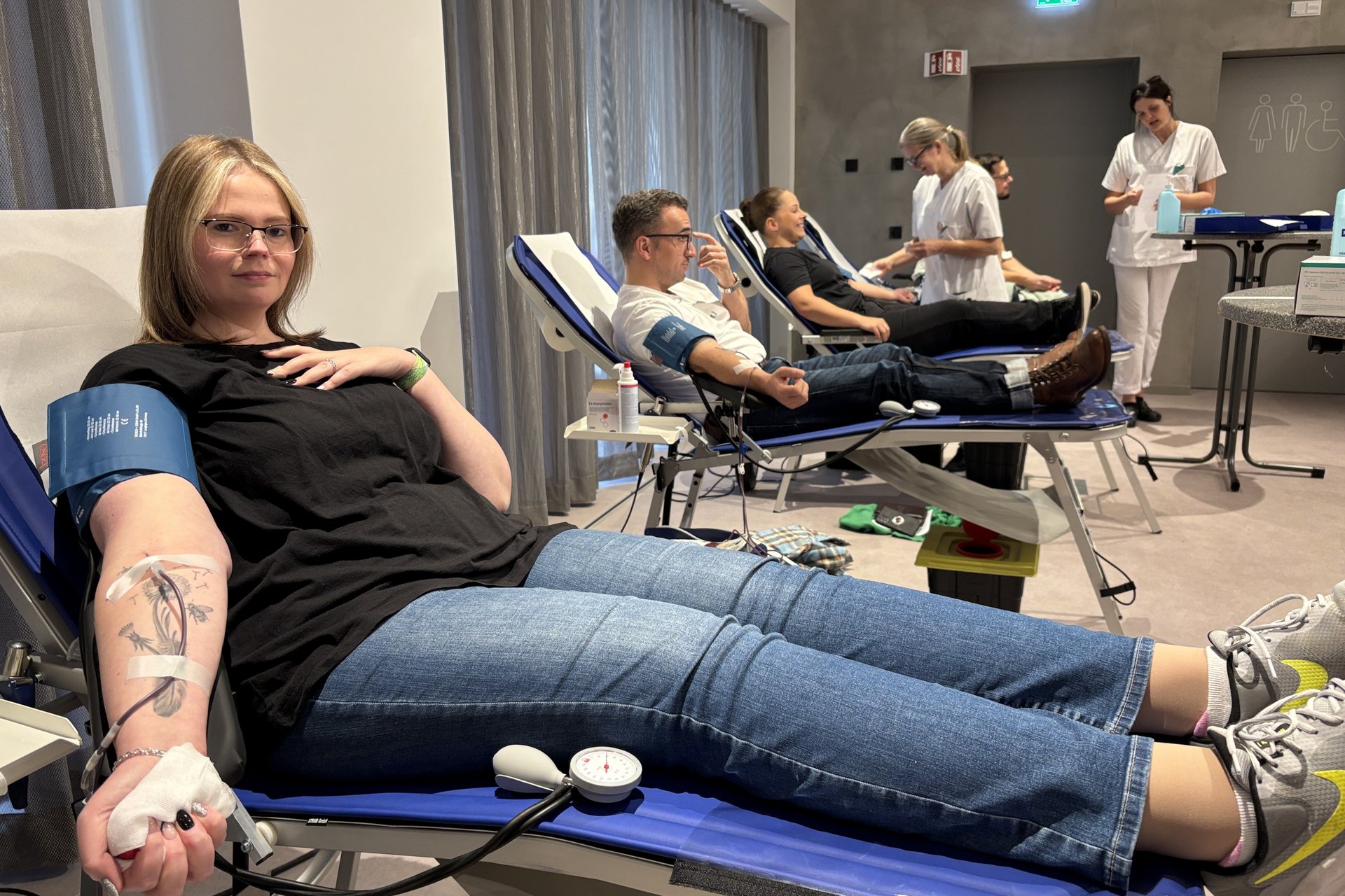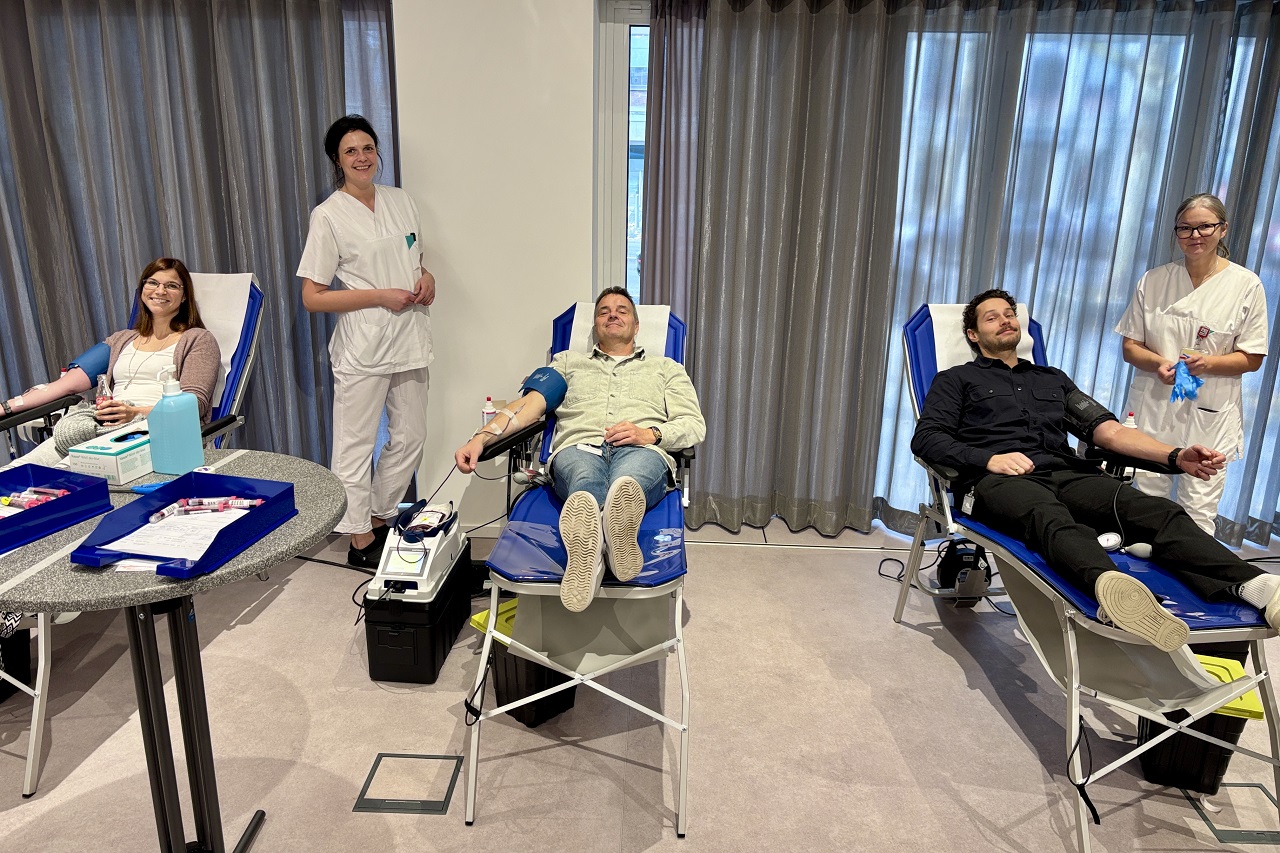 Als die Türen um 11 Uhr öffneten, standen die ersten Mitarbeitenden bereits Schlange. Karin Hochleitner machte den Anfang und legte sich als erste auf eine der vier Spenderliegen. Die Plätze neben ihr füllten sich schnell. Rund 40 Beschäftigte nutzten die Gelegenheit. In vier Stunden kamen etwa 20 Liter Blut zusammen.